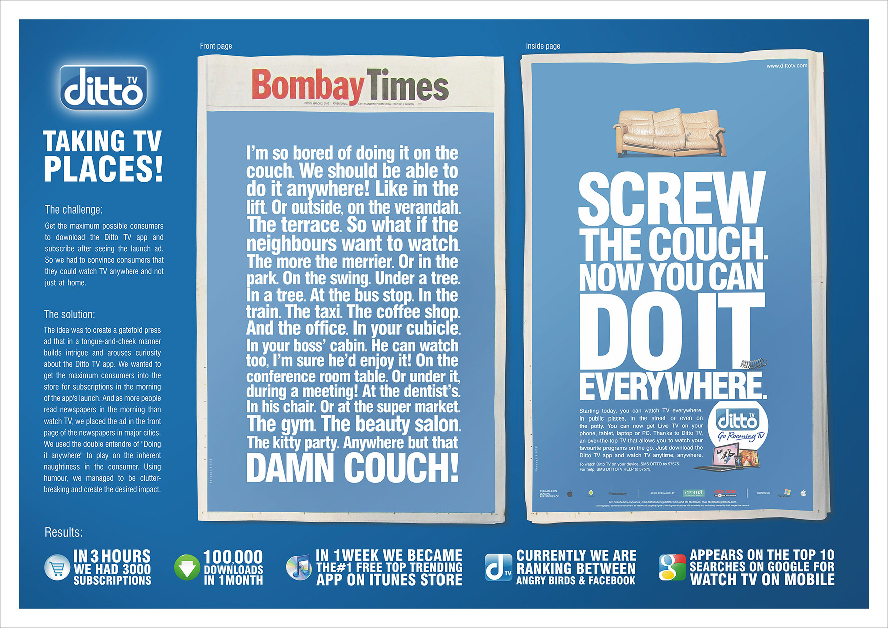 The execution ideas for the launch of this app were distinct for various mediums. For print we had full page ads, an inherent naughty teaser about the places you can “do it” and a reveal ad saying “Screw the couch. Now you can do it everywhere”.